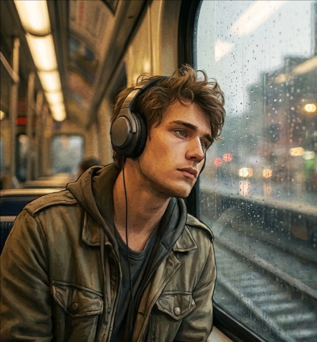 "The rain streaked against the window of the midnight train, blurring the city lights into smears of..."